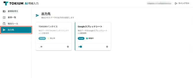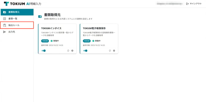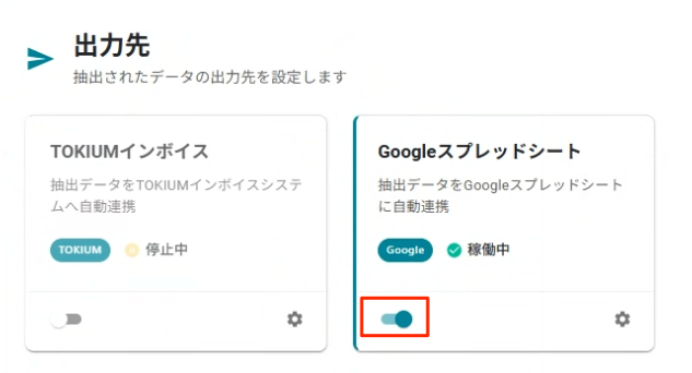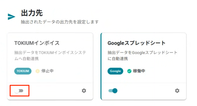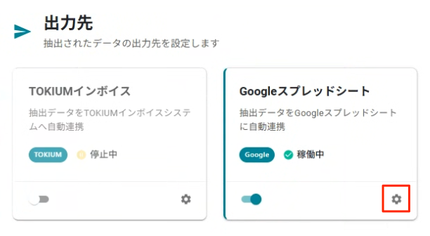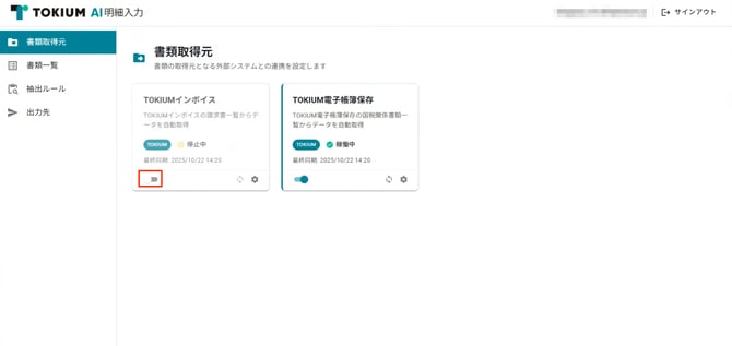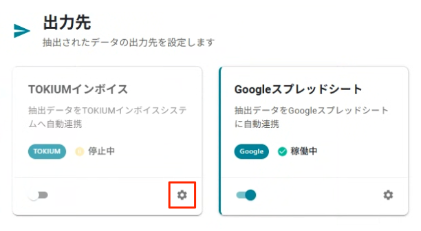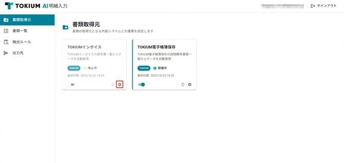②画面中央から利用したい書類取得元(TOKIUMインボイス・TOKIUM電子帳簿保存)を選び、[⚙️]をクリック