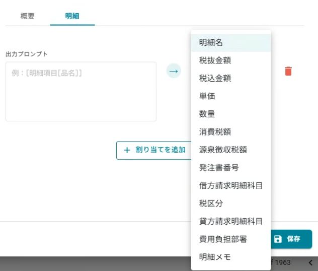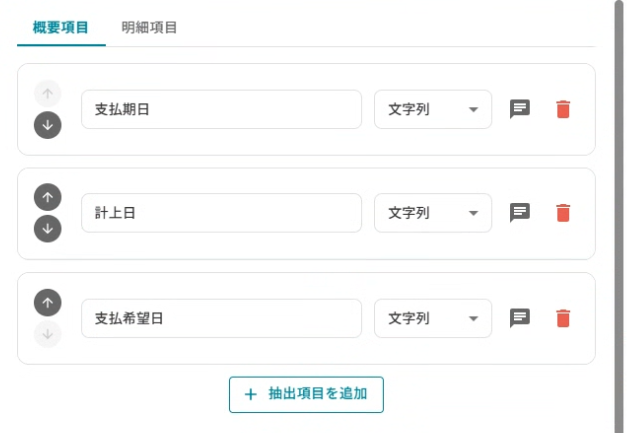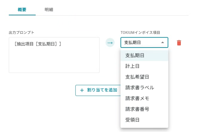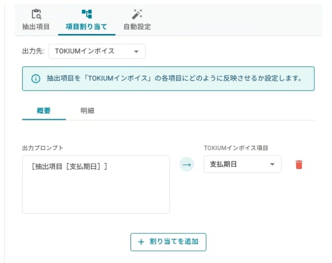 [抽出項目]で指定した各項目について、抽出した値をTOKIUMインボイスに対してどのように割り当てるのか設定できます。
