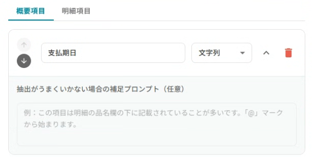 この入力欄に日本語の文章で項目の説明を加えることで、項目の抽出に細かな指示修正ができます。