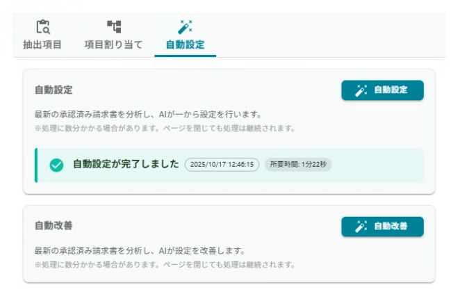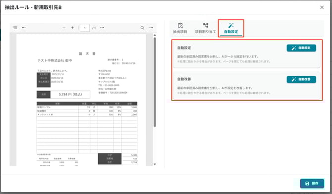※承認済み請求書が無い場合はサンプル画像から推測して設定されます - 自動改善:既に抽出項目・項目割り当ての設定が存在している場合、最新の請求書情報を参照して自動で設定の修正を行う