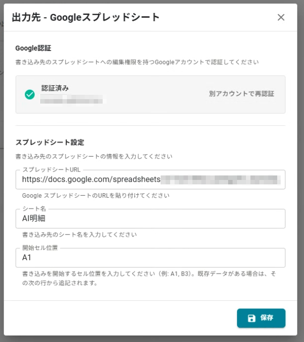 [抽出項目]で指定した各項目について、抽出した値をGoogleスプレッドシートに対してどのように割り当てるのか設定できます。