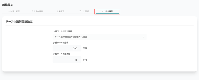 - 組織の環境作成時 又は リースの識別機能をONにした際に、設定した少額リースの設定値が確認できる