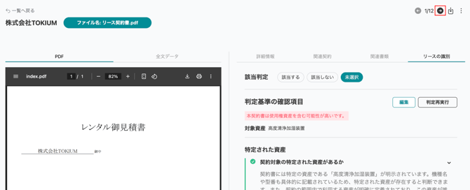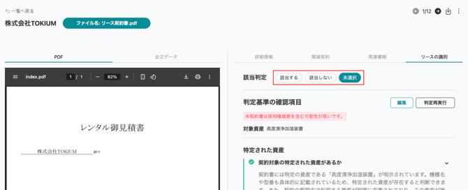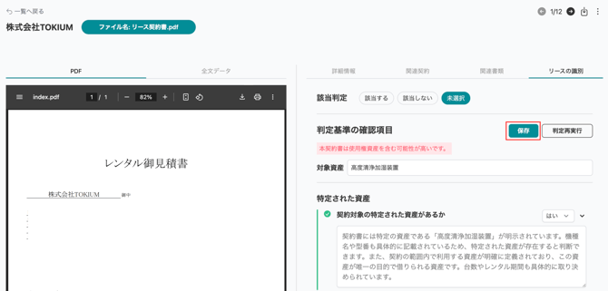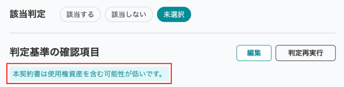 - 契約書やリースの判定結果を基に、最終的な判定として「該当判定」を選択する