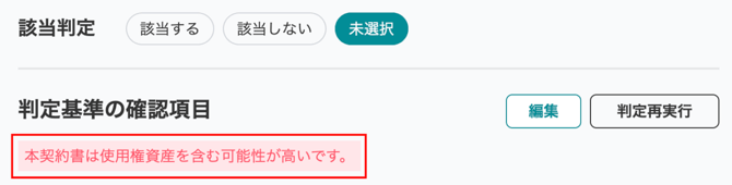 - 判定フローにおいて、リースに含まれる可能性が高いと判断された場合、「本契約書は使用権資産を含む可能性が高いです」と表示されます。