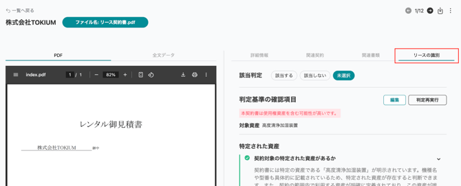本機能は、TOKIUM契約管理にアップロードされた契約書が新リース会計基準対象かの洗い出しをサポートします。リースの識別画面で、AIがリースに含まれるかを自動判定した結果が表示されます。