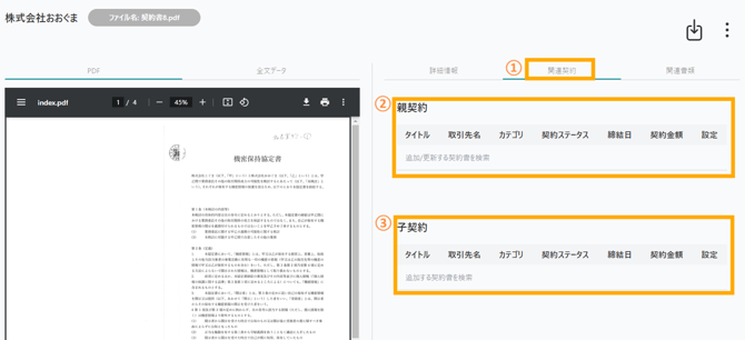 同じフォルダ内の契約書のみ表示されます。親契約が別のフォルダに登録されている契約書の場合はまとめて表示されません。