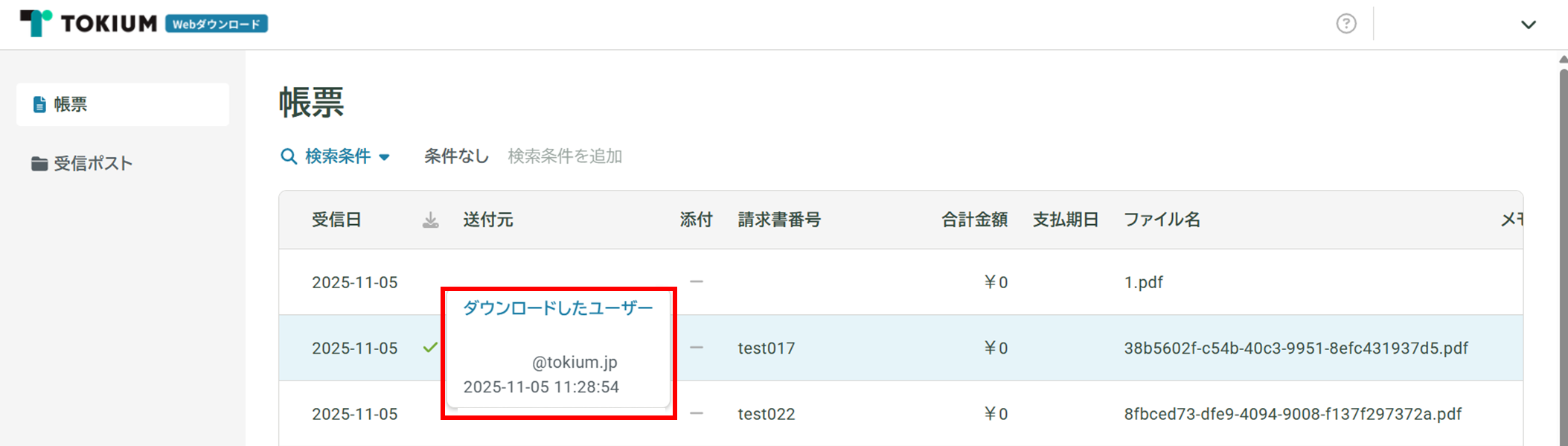 帳票一覧を表示し、ダウンロード状況の✅アイコンにマウスの位置を合わせると、