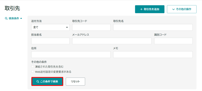 ②条件を入力し検索画面下の[この条件で検索]をクリックします。すると、条件に該当する取引先が表示されます。