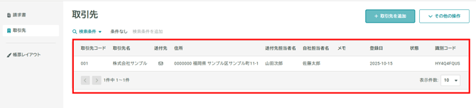 取引先に設定されている送付先担当者名で、部分一致検索ができます。