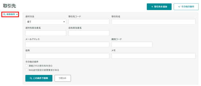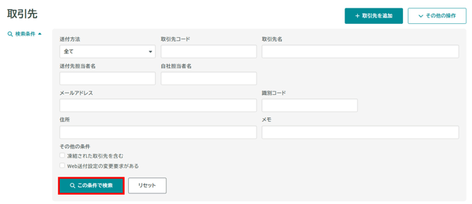 ②条件を入力し検索画面下の[この条件で検索]をクリックします。すると、条件に該当する取引先が表示されます。