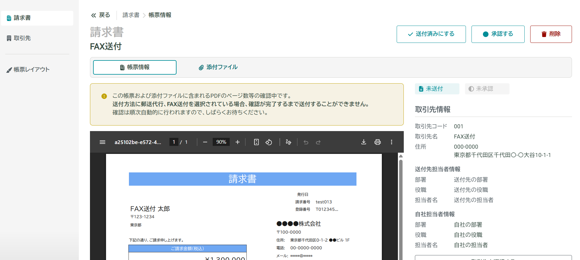請求書作成直後/添付ファイルアップロード時は、PDFの検証を行うためFAX送付の送付が行えません。