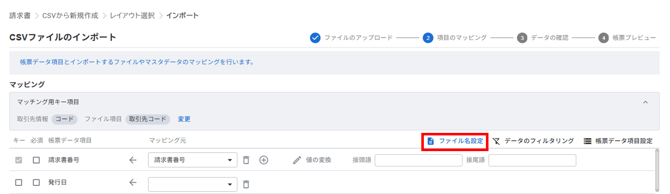 請求書を画面から送付するには、作成する請求書データに取引先情報を紐づける必要があります。そのため、取引先情報と請求CSVデータの対応する項目(マッチング用キー項目)を設定します。