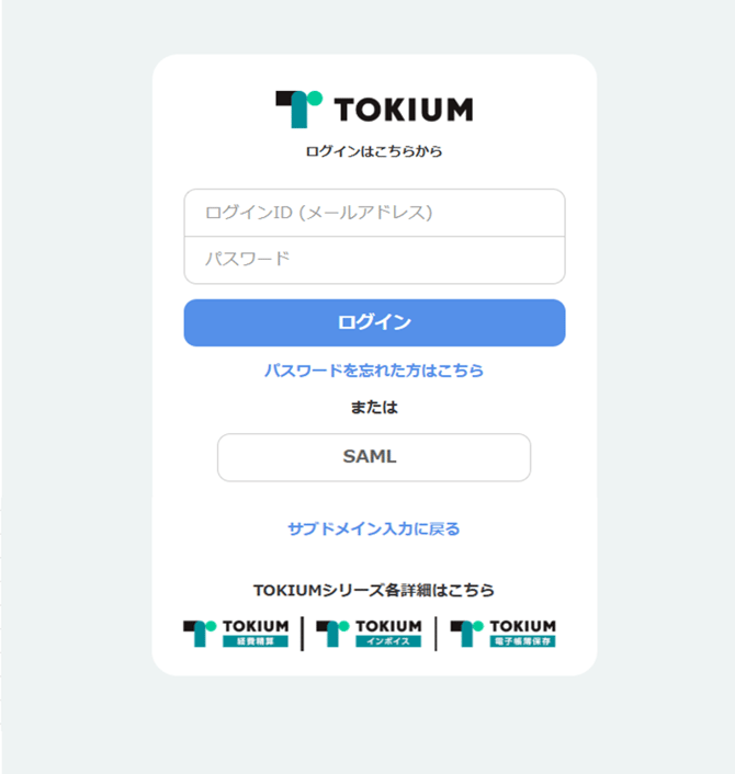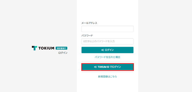 TOKIUM IDでログインする TOKIUM IDでのシステムへのログイン方法を説明します。 ログイン方法 ログイン画面にアクセスします。 ログイン画面で [TOKIUM IDでログイン] ボタンをクリックします。 専用のログイン画面より、ログインを行います。 TOKIUM請求書発行にログインし、必要な操作を行うことができます。